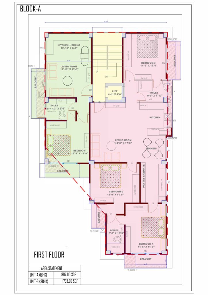 Ceramics glazed wall tiles flooring, Anti-skid tiles with wash basin European W.C., Jaquar or equivalent make Geyser provision in all toilets, Vanity under wash basin